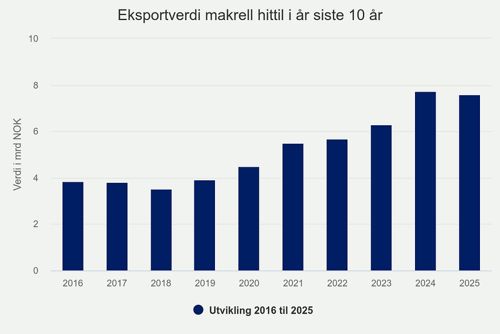 03.12.2025 12:06 | Av Martine KorsøenI forrige måned eksporterte Norge 21.655 tonn makrell. Det er det laveste volumet i en november-måned siden 2010 og en nedgang på 51 prosent sammenlignet med november i fjor.
