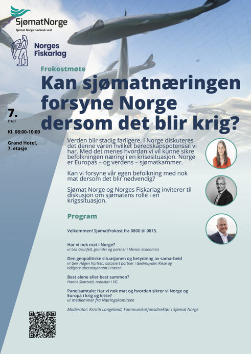 Sjømat Norge og Norges Fiskarlag inviterer til frokostmøte med diskusjon om sjømatens rolle i en krigssituasjon.