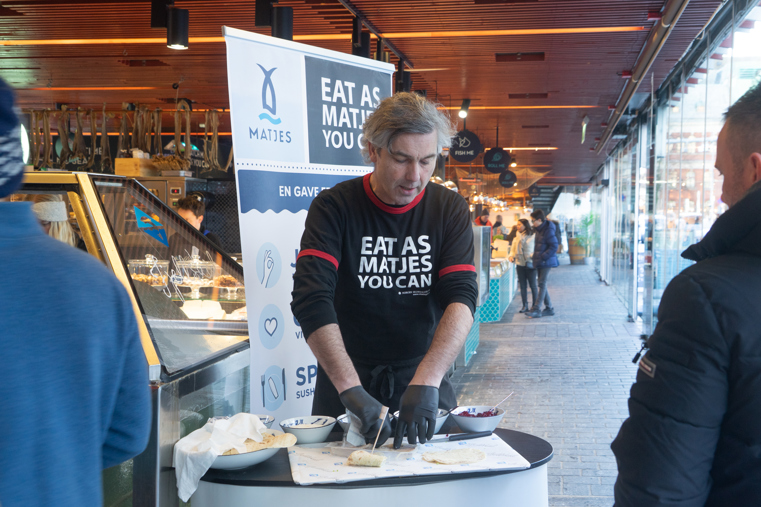 (Foto: Sildelaget - Arjen tilbereder matjes i lompe til besøkende i Mathallen.)